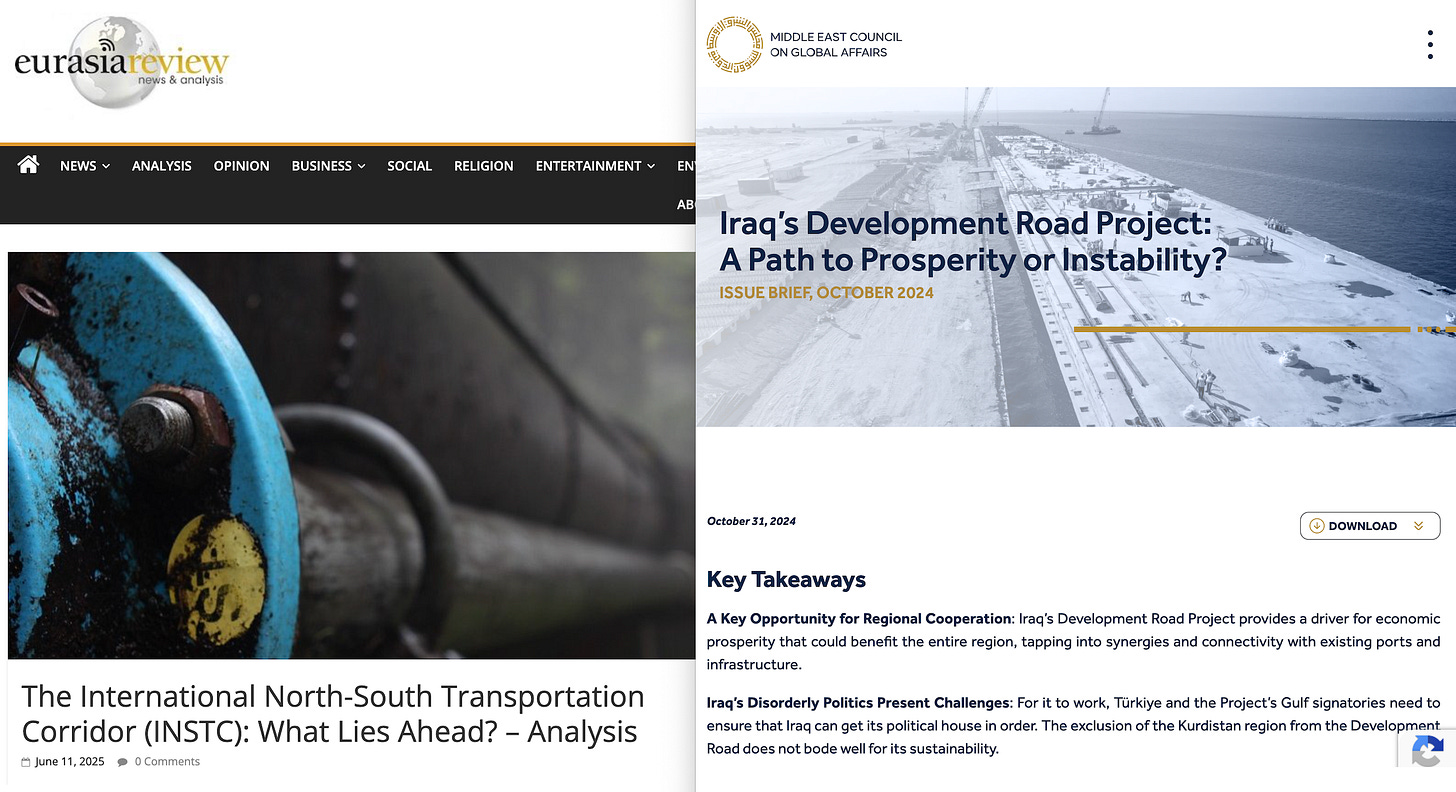 Iraq’s Development Road — the $17 billion project connecting Basra to Turkey, with Chinese engineering involvement — would have given the Eastern clearing system a land route bypassing both Hormuz and Israel32. The International North-South Transport Corridor, running from Mumbai to Moscow via Iran and Azerbaijan, is a second competing route33 — one that India’s own Director General of Maritime Administration describes as offering 30 per cent cost savings and 40 per cent faster transit34.
